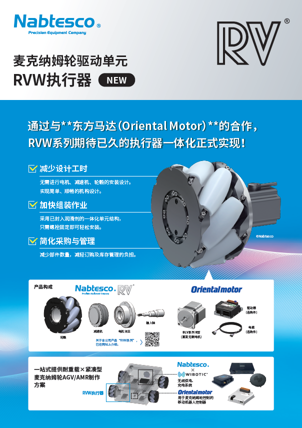 將精密減速機RV内置於麥克納姆輪轂内的輪轂内置減速機構造。 實現了緊凑性與大型AGV所需的高負載的并存。